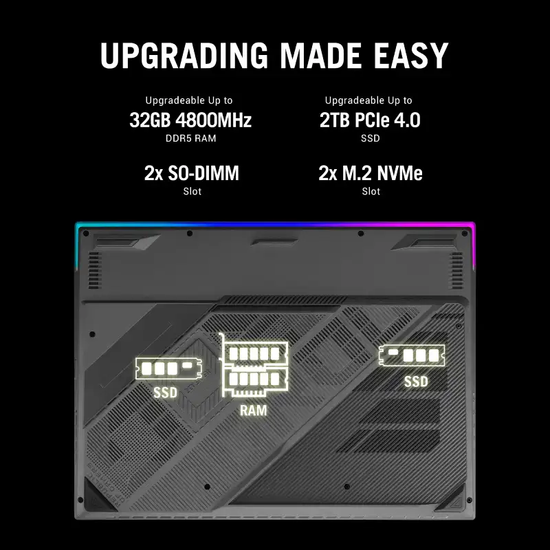 | Graphics | 8GB GDDR6 NVIDIA® GeForce RTX™ 4060 Laptop GPU (233 AI TOPs) with ROG Boost: 2420MHz* at 140W (2370MHz Boost Clock+50MHz OC, 115W+25W Dynamic Boost) having MUX Switch + NVIDIA® Advanced Optimus |