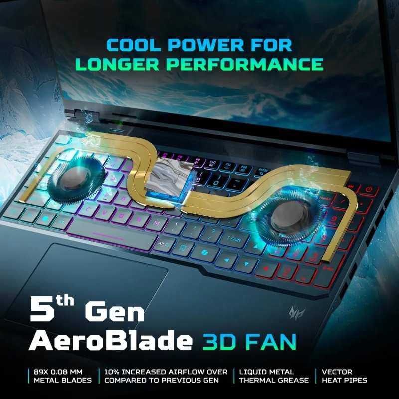 The chassis features a robust design with a textured finish, contributing to both aesthetics and grip. The laptop incorporates an efficient cooling system with multiple heat pipes and fans, designed to dissipate heat effectively during extended gaming sessions and maintain optimal performance.