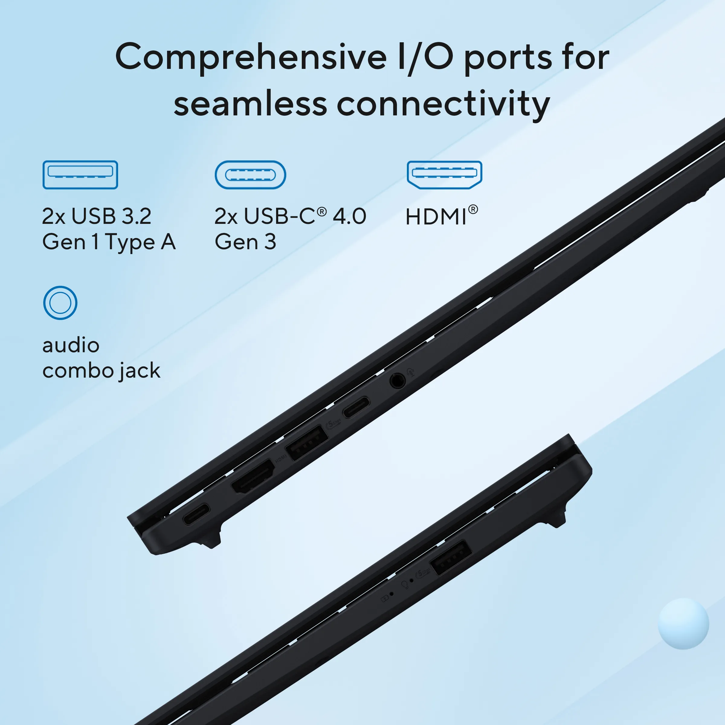 I/O PORTS | 2x USB 3.2 Gen 1 Type-A (data speed up to 5Gbps) 2x USB 3.2 Gen 1 Type-C with support for display / power delivery (data speed up to 5Gbps) 1x HDMI 1.4 1x 3.5mm Combo Audio Jack |
